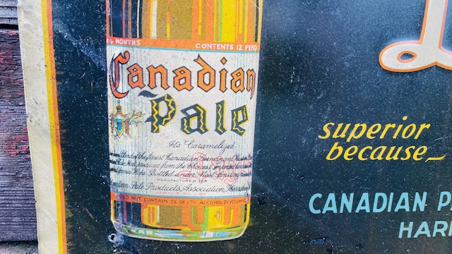The sign is approximately 20″ by 14″ and is made of embossed metal. Canadian Pale Lager was a prohibition-era malted beverage similar to “near-beer” which had an alcohol percentage between 1/2% – 1% alcohol by volume. Signs like these would have been displayed in general stores or cafes to advertise these malted beverages during prohibition when alcohol was outlawed throughout the United States.