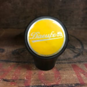 Here is a Daeufer Beer Ball Tap Knob from the Daeufer Brewing Company located in Allentown, PA. This Daeufer Beer Knob is from the 1940’s era and is in excellent condition for it’s age. It is made of a celluloid face mounted on a black bakelite body.