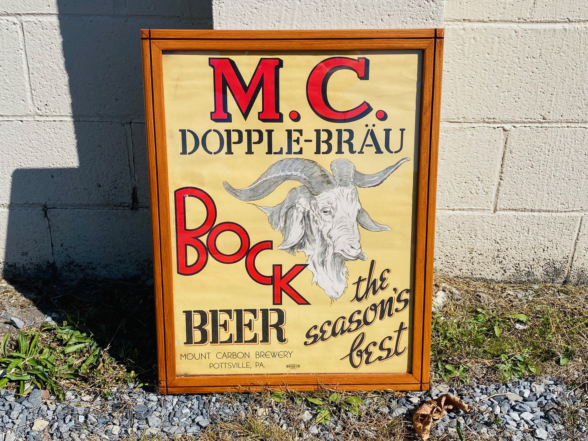Here is a Mount Carbon Bock Beer Sign from the Mount Carbon Brewing Company located in Pottsville, PA. This MC Dopple-Brau Bock Beer Litho is from the 1940’s era and is in good condition for its age. It is approximately 24″ X 36″ with metal hanging edges for display.