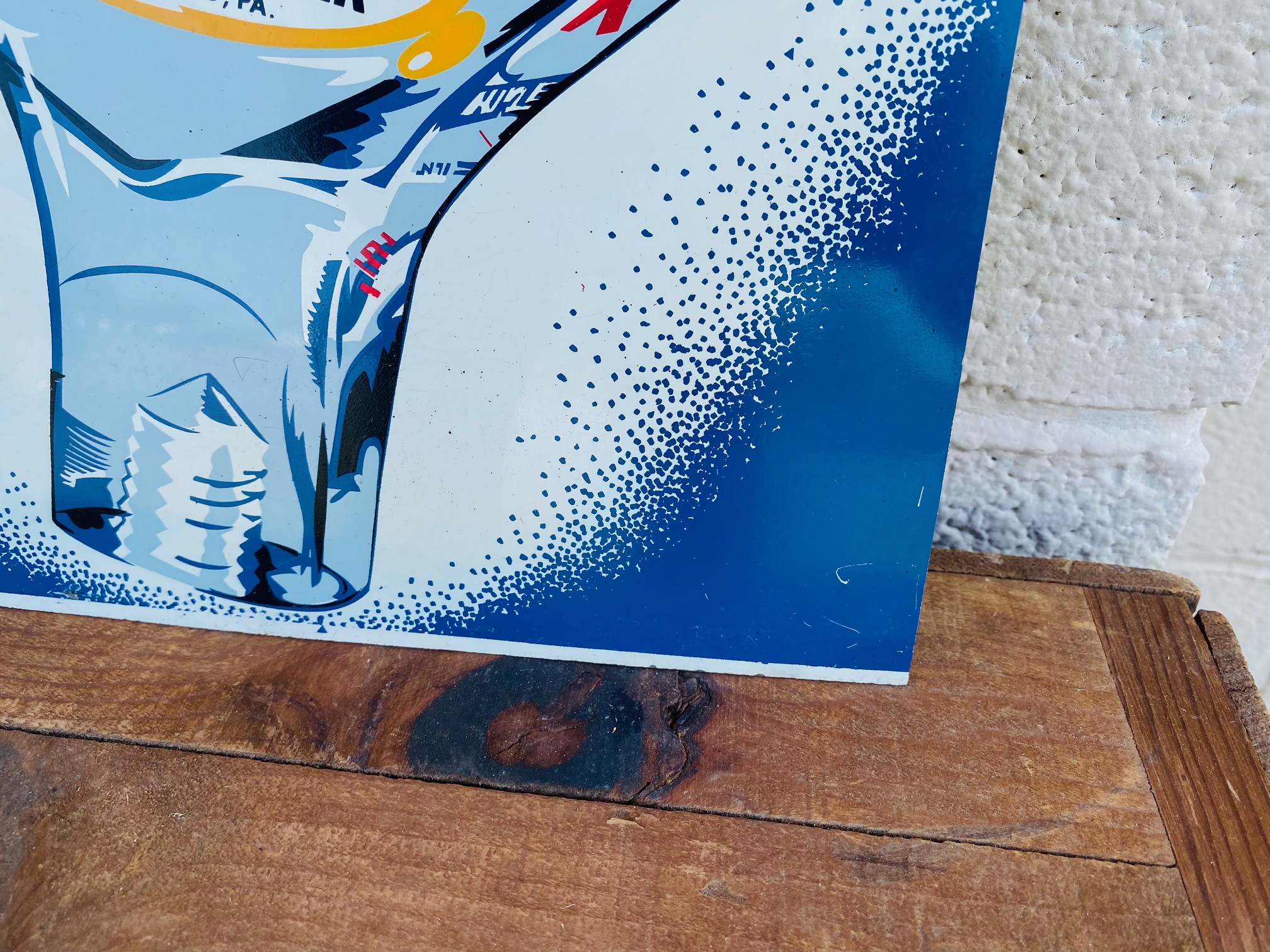 The sign is approximately 16″ by 8″ and is made of reverse-painted glass mounted in a metal frame with a cardboard backer. The sign was made by the S. S. Zentner & Company located in Beaver, PA. Signs like these would have been hung on the wall or displayed with the cardboard easel back on a bar countertop.